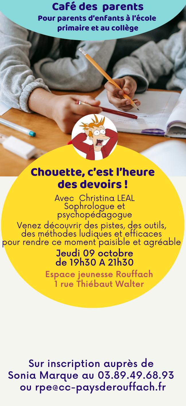 Christina LEAL, sophrologue et psychopédagogue viendra vous donner quelques clés afin de rendre le moment des devoirs plus paisible : pistes, outils, méthodes ludiques et efficaces vous seront proposés. N’hésitez pas à vous y inscrire, ce moment avec votre enfant peut devenir paisible et agréable !