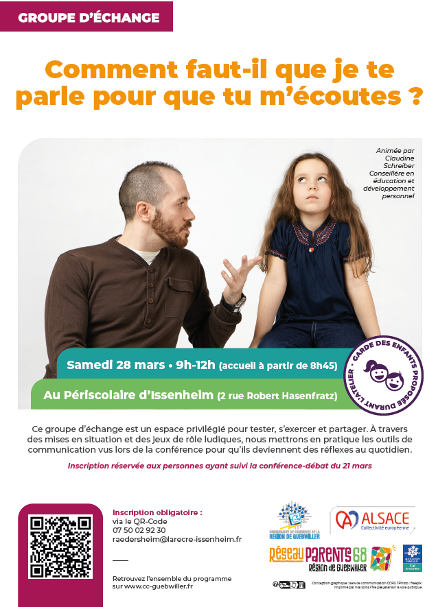 Ce groupe d’échange est un espace privilégié pour tester, s’exercer et partager. À travers des mises en situation et des jeux de rôle ludiques, nous mettrons en pratique les outils de communication vus lors de la conférence pour qu’ils deviennent des réflexes au quotidien.