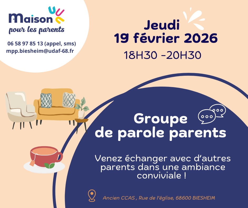 La Maison pour les Parents vous propose un groupe de parole en soirée pour les parents : espace bienveillant pour échanger entre parents et avec une professionnelle sur vos questions, vos difficultés, votre quotidien de parents.