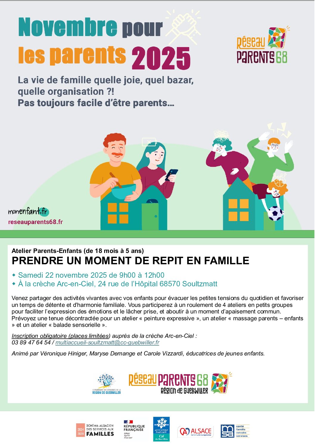 Venez partager des activités vivantes avec vos enfants pour évacuer les petites tensions du quotidien et favoriser un temps de détente et d’harmonie familiale. Vous participerez à un roulement de 4 ateliers en petits groupes pour faciliter l’expression des émotions et le lâcher prise, et aboutir à un moment d’apaisement commun. Prévoyez une tenue décontractée pour un atelier « peinture expressive », un atelier « massage parents – enfants » et un atelier « balade sensorielle ».