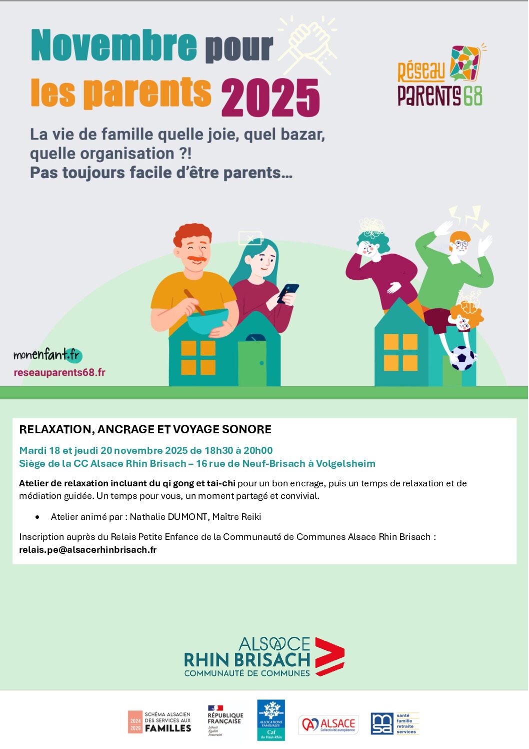 Atelier de relaxation incluant du Qi gong et tai-chi pour un bon encrage, puis un temps de relaxation et de médiation guidée. Un temps pour vous, un moment partagé et convivial.