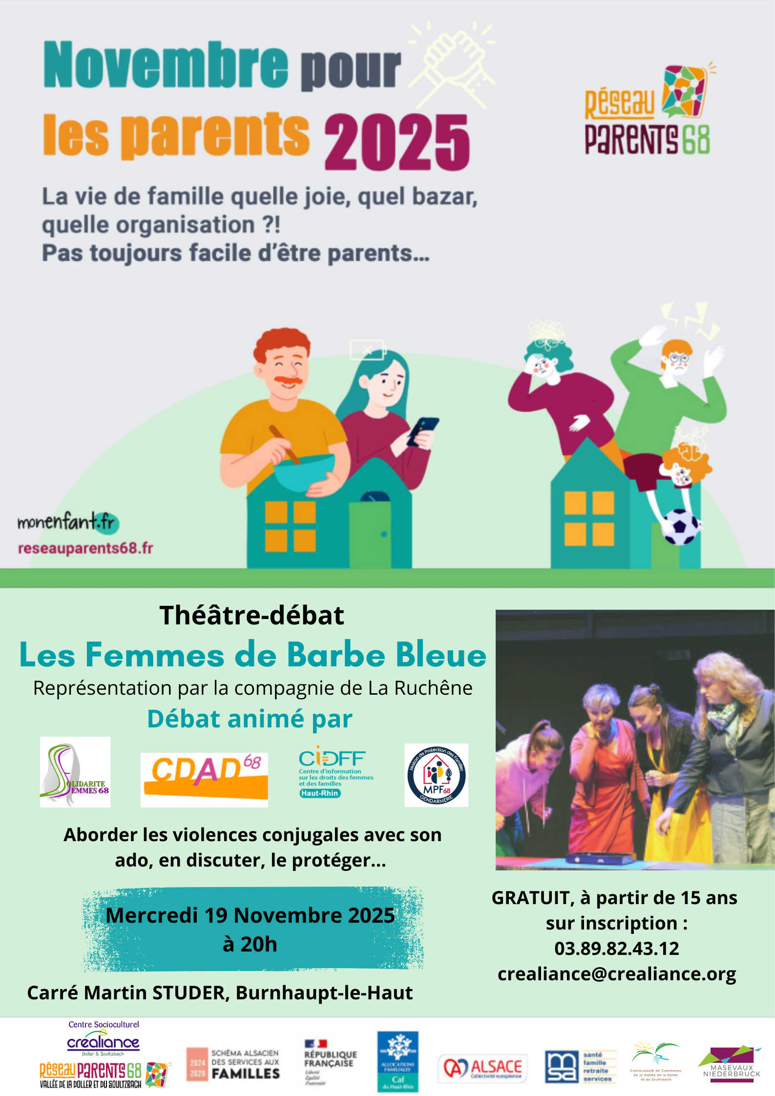 Représentation de la pièce de théâtre  « Les Femmes de Barbe Bleue » par la compagnie de la Ruchêne. La représentation sera suivie d’un débat animé par plusieurs intervenants : la Maison de protection des familles, le CIDFF du Haut-Rhin, Solidarité femmes 68 et le Conseil départemental de l’Accès au Droit du Haut-Rhin. Un temps convivial sera proposé à l’issue du débat.