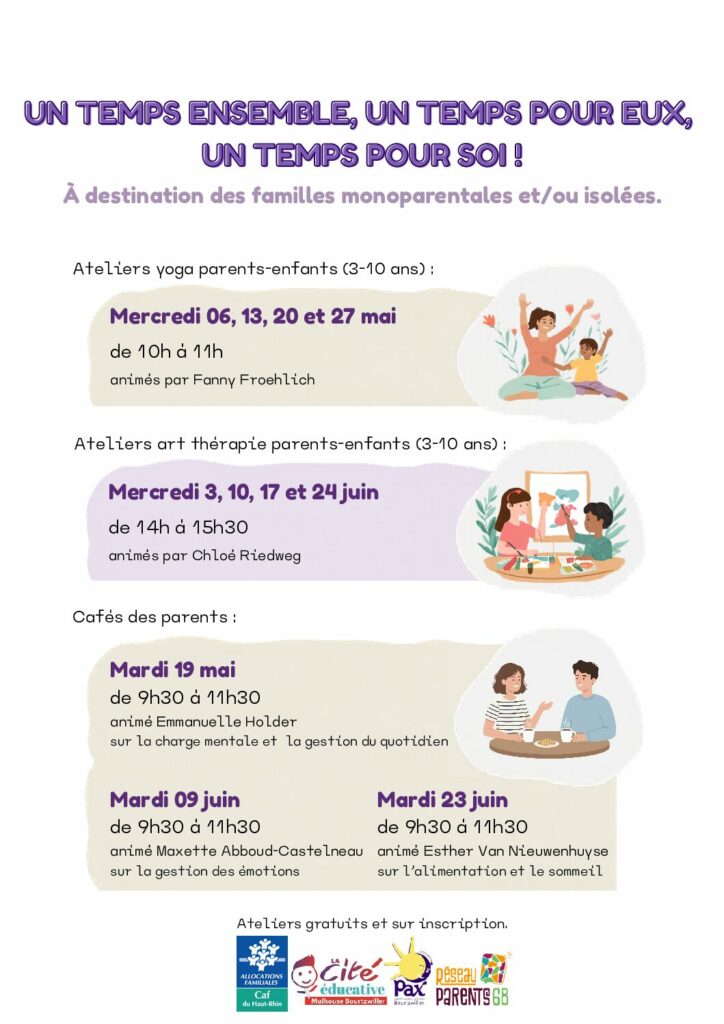 Lire la suiteVous êtes parents seuls ou sans famille autour de vous, vous avez envie de découvrir de nouvelles activités avec et sans votre votre enfant, venez participer à nos ateliers de yoga et d’art thérapie qui vous permettront de prendre une pause dans votre quotidien. 3 cafés des parents vous seront également proposés, animés par des intervenants spécialisés dans le développement de l’enfant. Ateliers gratuits, sur inscription, ouvert aux familles avec enfants de 3 à 10 ans. Garde d’enfant sur place lors des temps sans enfants.